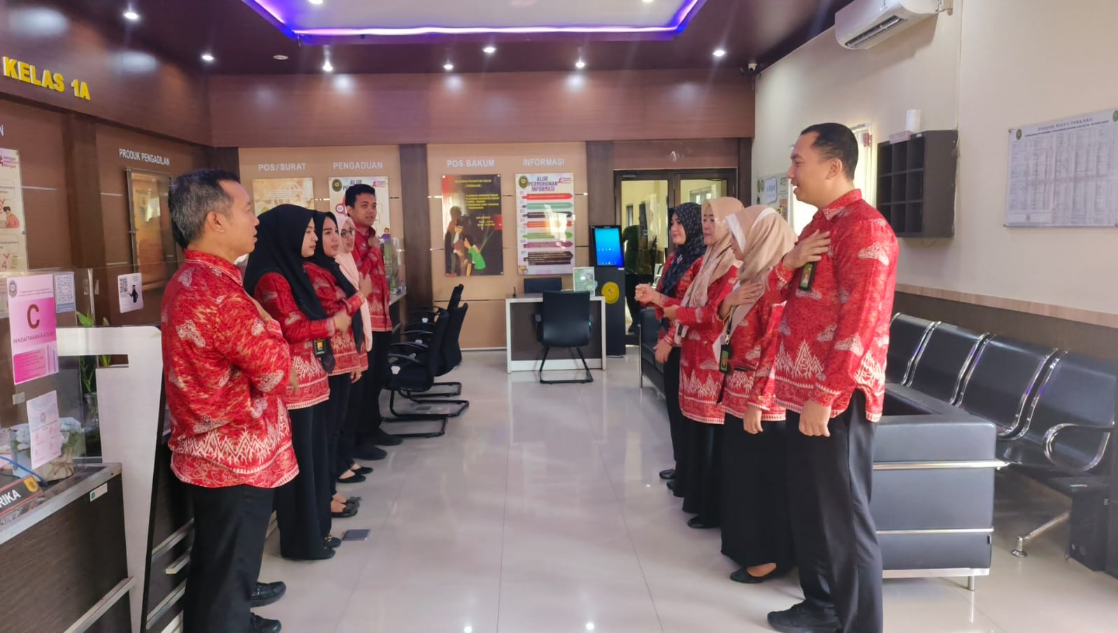 Bertempat di Ruang Pelayanan Terpadu Satu Pintu (PTSP) Pengadilan Agama Tanjungkarang Kelas IA, Panitera Muda bersama Manager on Duty (MoD) melaksanakan briefing kepada petugas PTSP ,Posbakum, Resepsionis dan Petugas Ruang Tunggu Sidang pada pukul 08.00 WIB.
