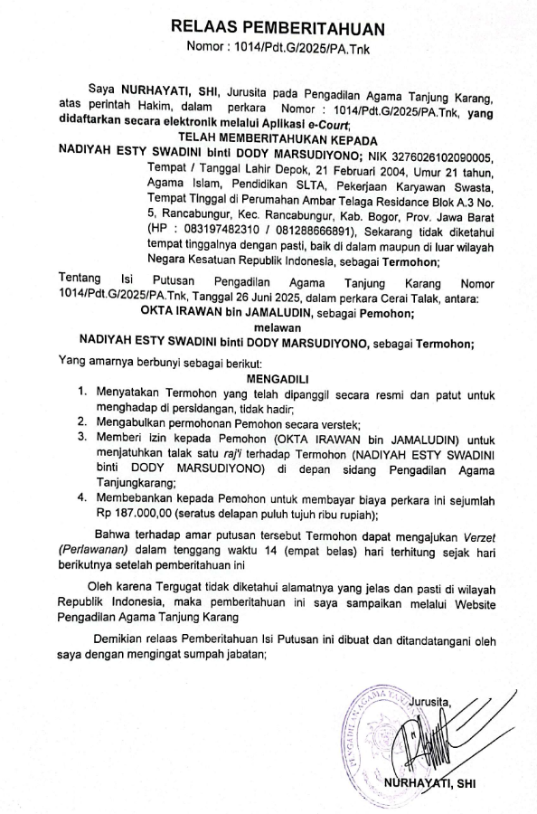 Pengumuman Pemberitahuan Nomor perkara 1014/Pdt.G/2025/PA.Tnk Ditulis oleh Mutia on 25 Juli 2025. Ditulis oleh Mutia on 25 Juli 2025. Dilihat: 236 Pengumuman Pemberitahuan Nomor perkara 1014/Pdt.G/2025/PA.Tnk ย