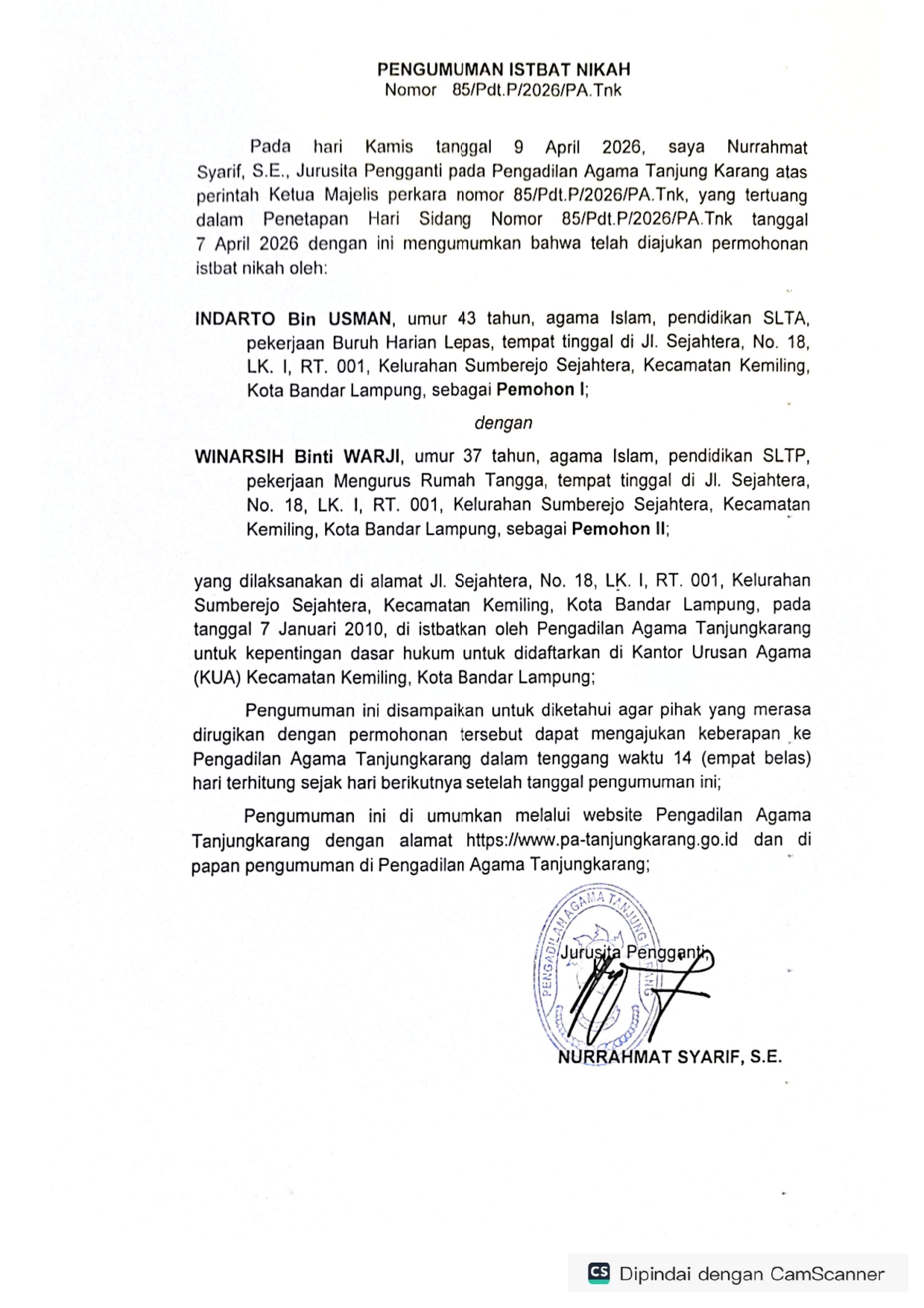 Pengumuman Istbat Nikah Nomor 85/Pdt.P/2026/PA.Tnk Ditulis oleh Redaksi on 09 April 2026. Ditulis oleh Redaksi on 09 April 2026. Dilihat: 21