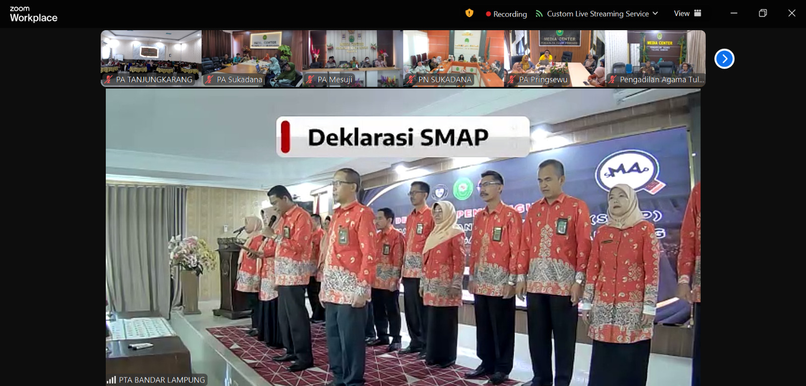 Ketua dan Wakil Ketua Pengadilan Agama (PA) Tanjungkarang menghadiri kegiatan Deklarasi Implementasi Pembangunan Sistem Manajemen Anti Penyuapan (SMAP) yang diselenggarakan oleh Pengadilan Tinggi Agama (PTA) Bandar Lampung di Aula PTA Bandar Lampung. Turut serta mengikuti kegiatan ini secara daring/online, Panitera, Sekretaris, serta seluruh Aparatur Sipil Negara (ASN) di lingkungan PA Tanjungkarang sebagai bentuk dukungan penuh terhadap gerakan anti-penyuapan dalam lingkungan peradilan agama.