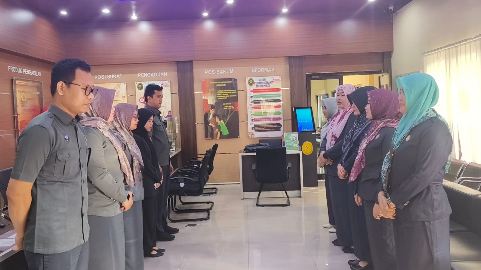 MoD hari ini, Jumirawati, S.H.I. bersama Kurnia Gustiati, S.H., M.H., menyampaikan arahan kepada seluruh petugas agar senantiasa memberikan pelayanan terbaik kepada para pencari keadilan. Dalam arahannya, MoD menekankan pentingnya penerapan budaya kerja 5S (Senyum, Salam, Sapa, Sopan, Santun) dan 5R (Ringkas, Rapi, Resik, Rawat, Rajin) secara konsisten untuk menciptakan lingkungan pelayanan yang profesional, ramah, dan nyaman.