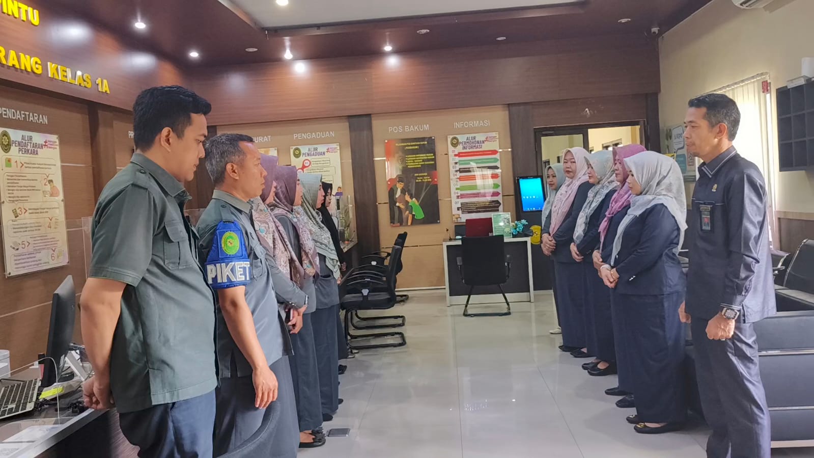 Bertempat di Ruang Pelayanan Terpadu Satu Pintu (PTSP) Pengadilan Agama Tanjungkarang Kelas IA, Panitera, Panitera Muda, serta Manager on Duty (MoD) Jumirawati, S.H.I., dan Kurnia Gustiati, S.H., M.H., melaksanakan briefing pagi. Kegiatan ini diikuti oleh seluruh petugas PTSP, Posbakum, ruang sidang, dan resepsionis pada pukul 08.00 WIB.