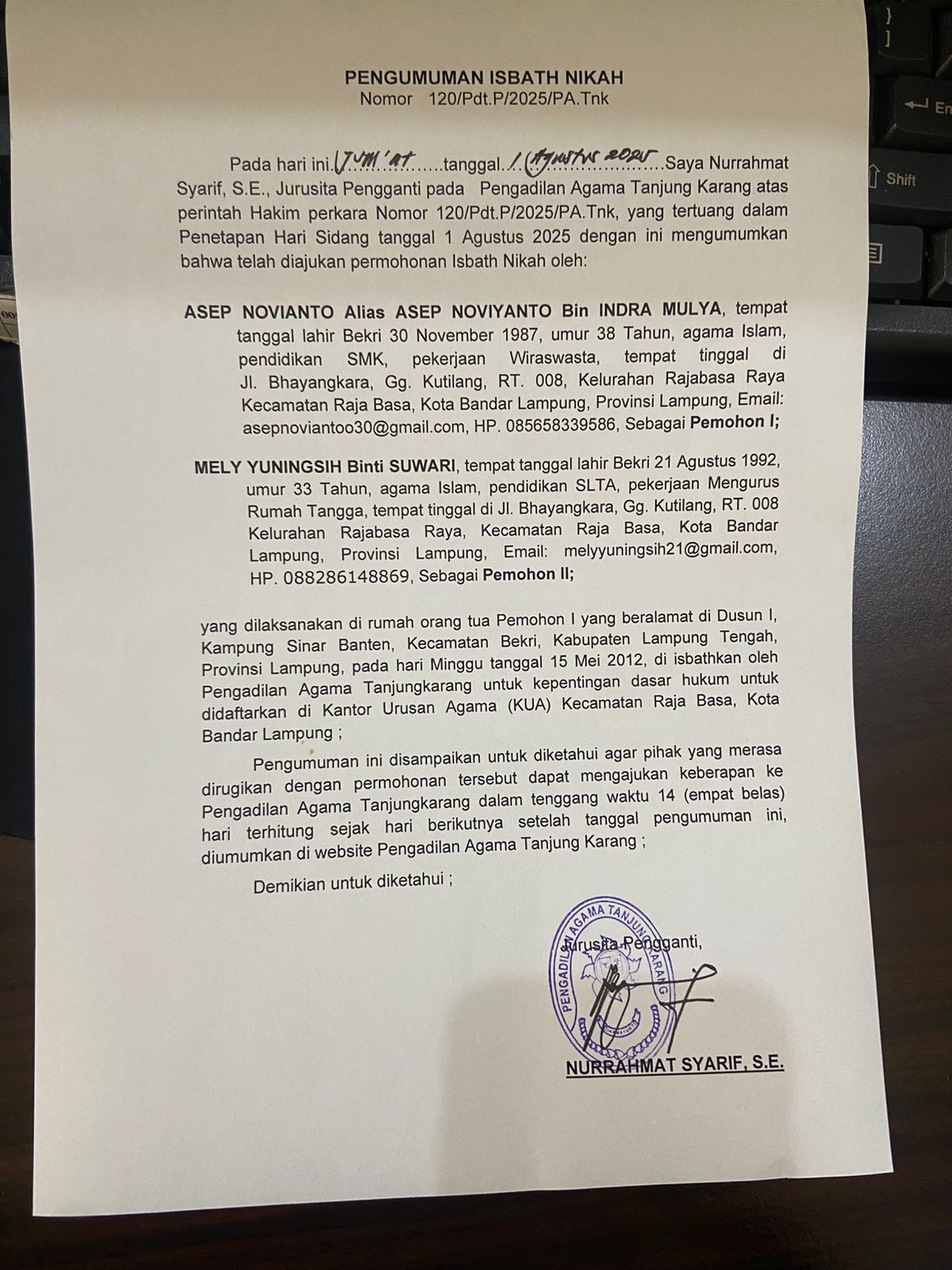 PENGUMUMAN ISBATH NIKAH PERKARA NO 120/Pdt.P/2025/PA.Tnk Ditulis oleh Redaksi on 01 Agustus 2025. Ditulis oleh Redaksi on 01 Agustus 2025. Dilihat: 220