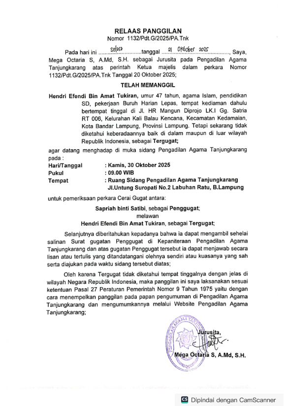 RELAAS PANGGILAN PERKARA NO.1132/Pdt.G/2025/PA.Tnk Ditulis oleh Mutia on 21 Oktober 2025. Ditulis oleh Mutia on 21 Oktober 2025. Dilihat: 16 RELAAS PANGGILAN PERKARA NO.1132 ย