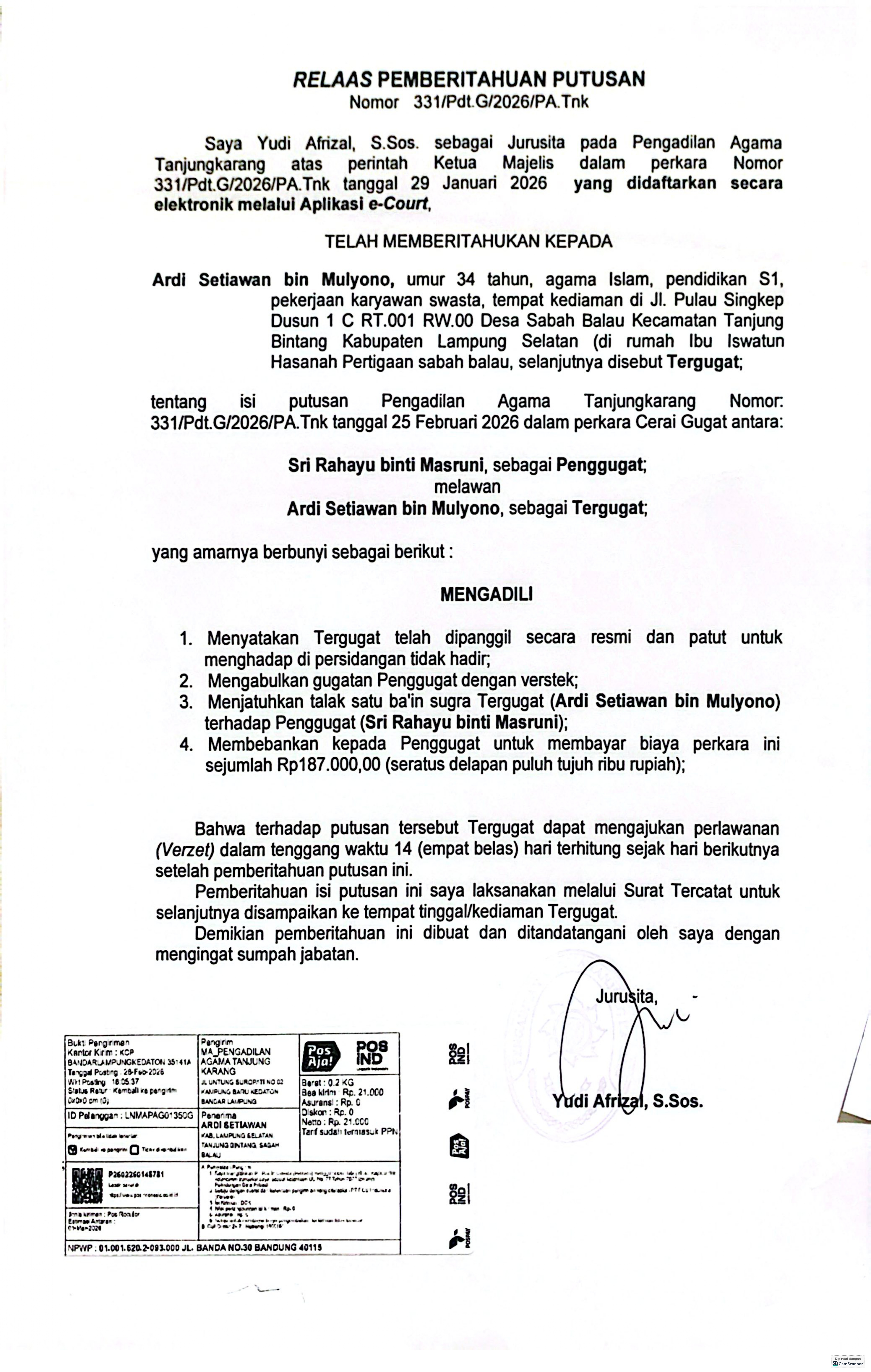 RELAAS PEMBERITAHUAN PUTUSAN Nomor perkara 331/Pdt.G/2026/PA.Tnk Ditulis oleh Redaksi on 04 Maret 2026. Ditulis oleh Redaksi on 04 Maret 2026. Dilihat: 59